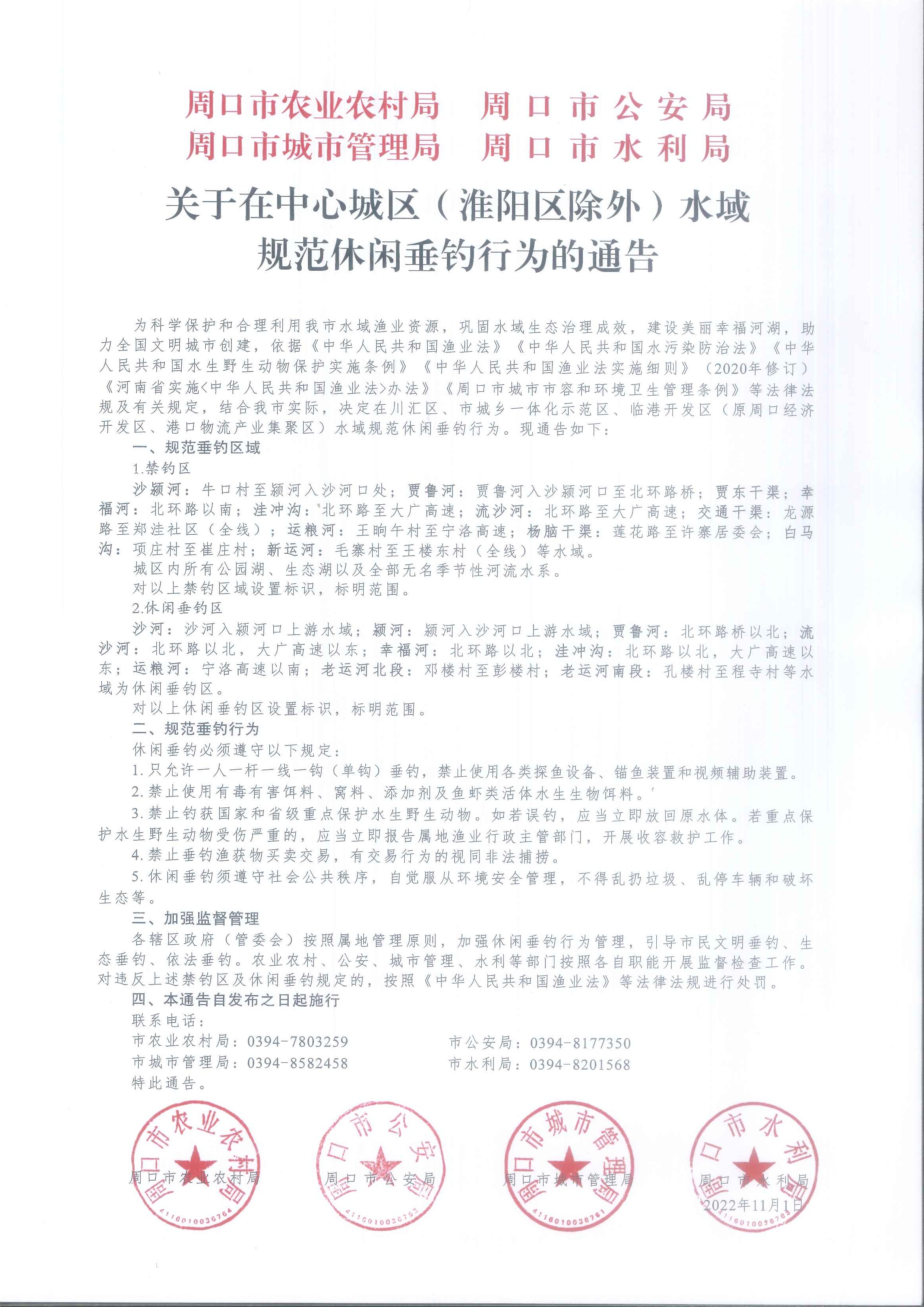 周口市农业农村局 周口市公安局 周口市城市管理局 周口市日博365备用网站_365在线登录app_365bet体育手机关于在中心城区(淮阳区除外)水域规范休闲垂钓行为的通告